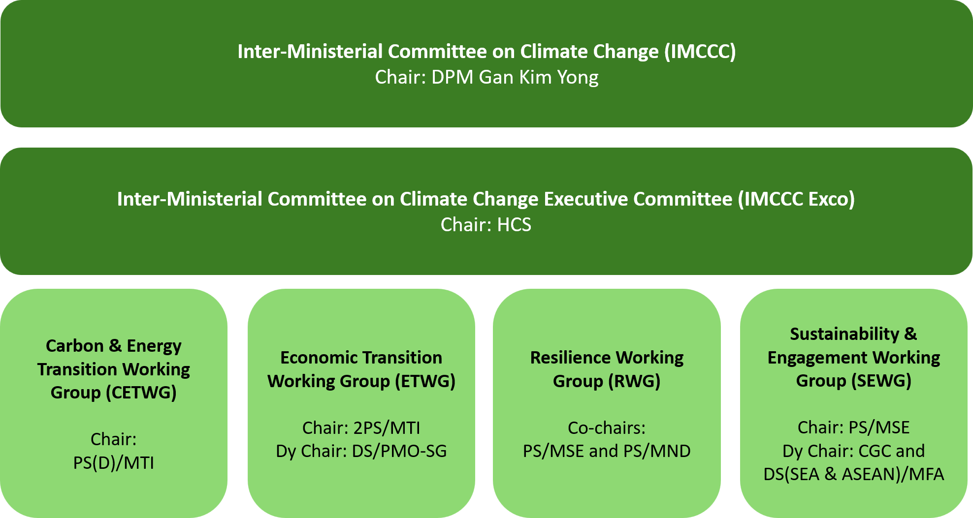 IMCCC is supported by an Executive Committee (Exco) comprising the permanent secretaries of the respective Ministries. The IMCCC Exco oversees the work of the Carbon & Energy Transition Working Group (CETWG), Economic Transition Working Group (ETWG), Resilience Working Group (RWG) and Sustainability & Engagement Working Group (SEWG).