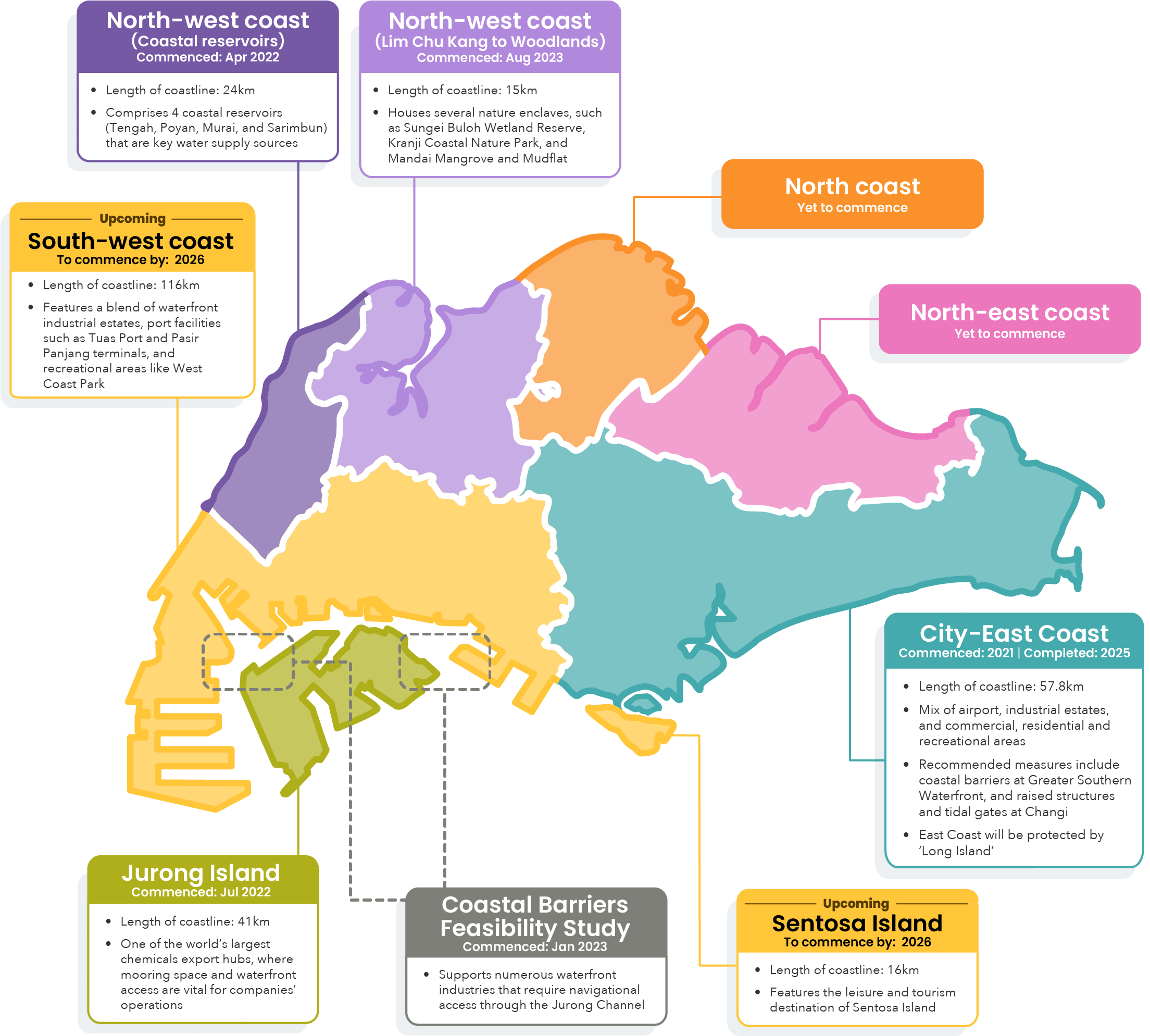 Since 2021, Singapore has progressively commenced site-specific studies (SSS) at various sections of the coastline to develop tailored coastal protection measures. The SSS for City-East Coast, which covers the Greater Southern Waterfront, Changi and the East Coast, was completed in 2025.