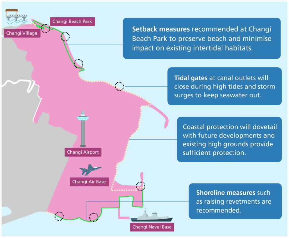 The SSS for City-East Coast has recommended building coastal barriers at the Greater Southern Waterfront, as well as a mixture of raised structures and tidal gates at Changi. These measures will be multi-functional spaces and protect Singapore from coastal flooding. Further studies will be carried out to develop a detailed design of the measures.